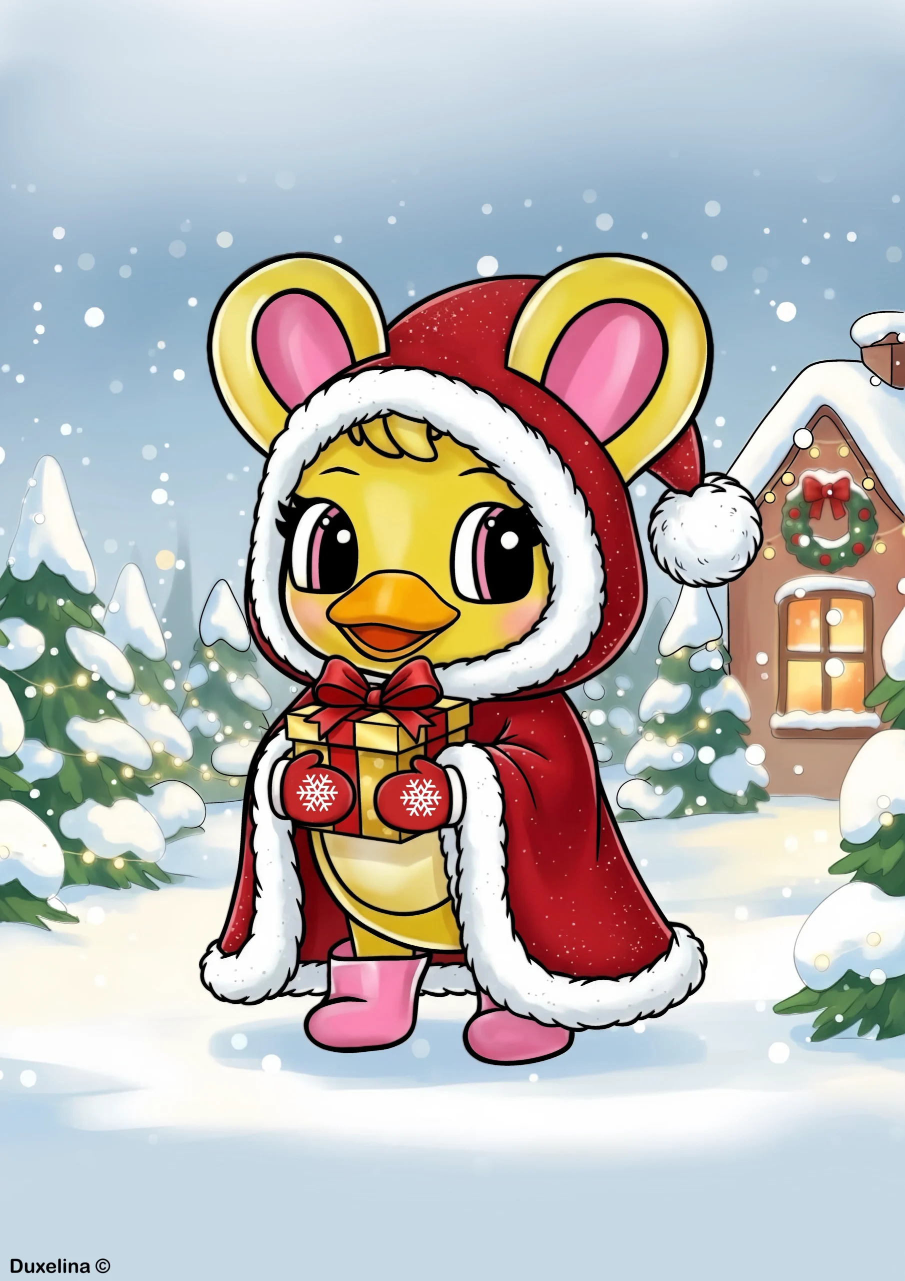 Merry Christmas! Our precious cute rubber duck, Duxelina, is ready to deliver a special gift in the snowy village. She is wearing a cozy, sparkly Santa cloak and mittens! This lovely rubber duck christmas coloring page is one of the best easy coloring pages for kids to enjoy during the magical holiday coloring pages season. Look at the little gingerbread house and the snowy Christmas trees behind her!
