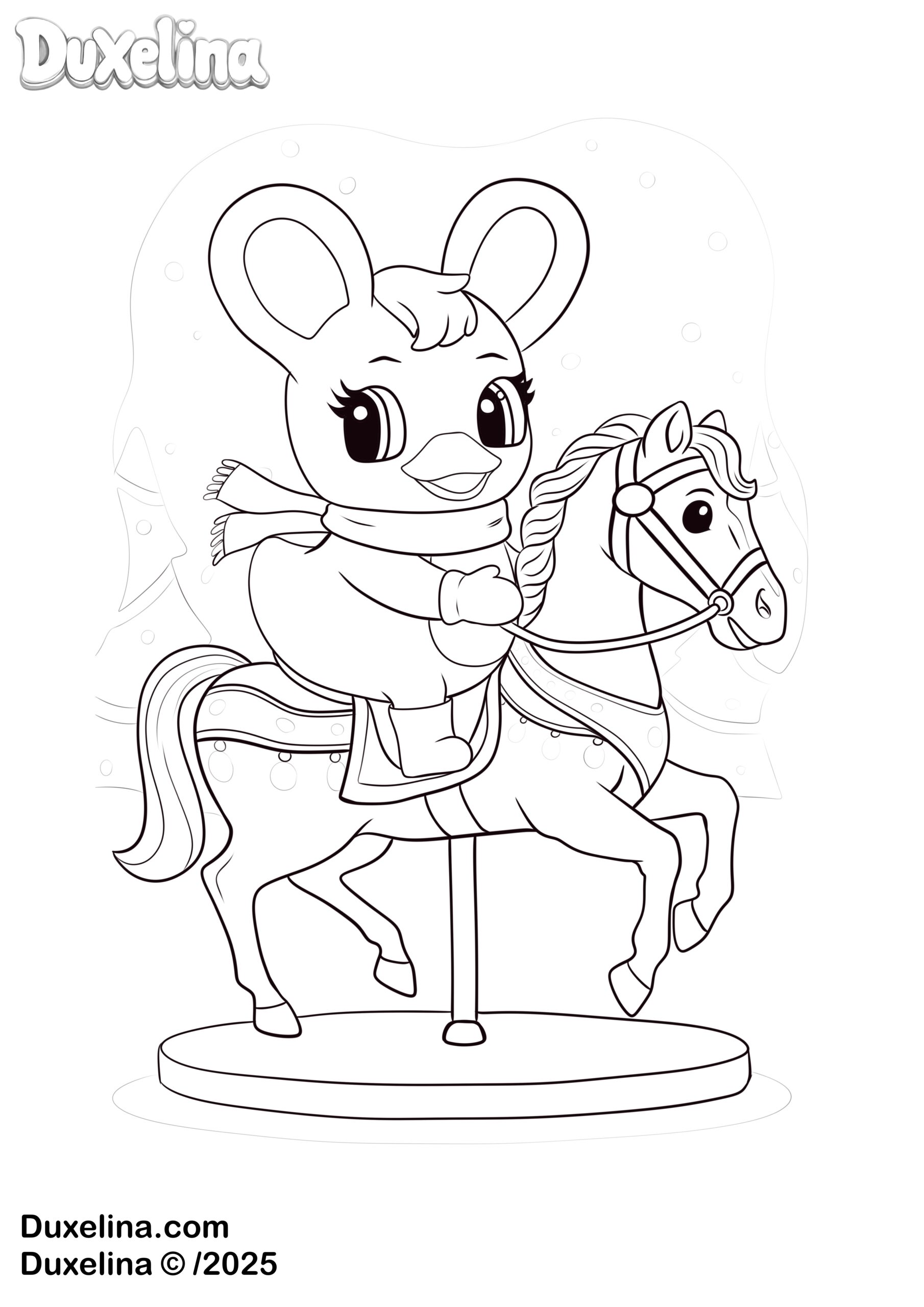 Get ready for a magical ride with Duxelina! Our adorable cute rubber duck is having the best time on a festive merry-go-round. She’s sitting on a beautiful red carousel horse, all ready for fun! This charming scene makes a wonderful merry-go-round coloring page that is perfect for easy coloring pages for kids. It’s a joyful addition to our collection of free coloring pages.
