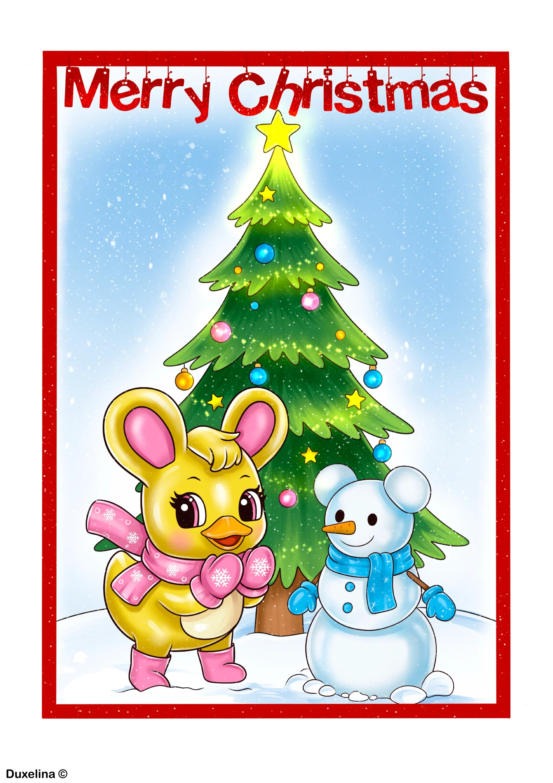 Merry Christmas! Our adorable cute rubber duck, Duxelina, has found a brand new friend: a happy snowman! They are standing together next to a beautiful, decorated Christmas tree in the snow. This charming rubber duck christmas coloring page is one of the best easy coloring pages for kids who love the cozy holiday coloring pages season. Duxelina is ready for fun in her cute pink winter gear!