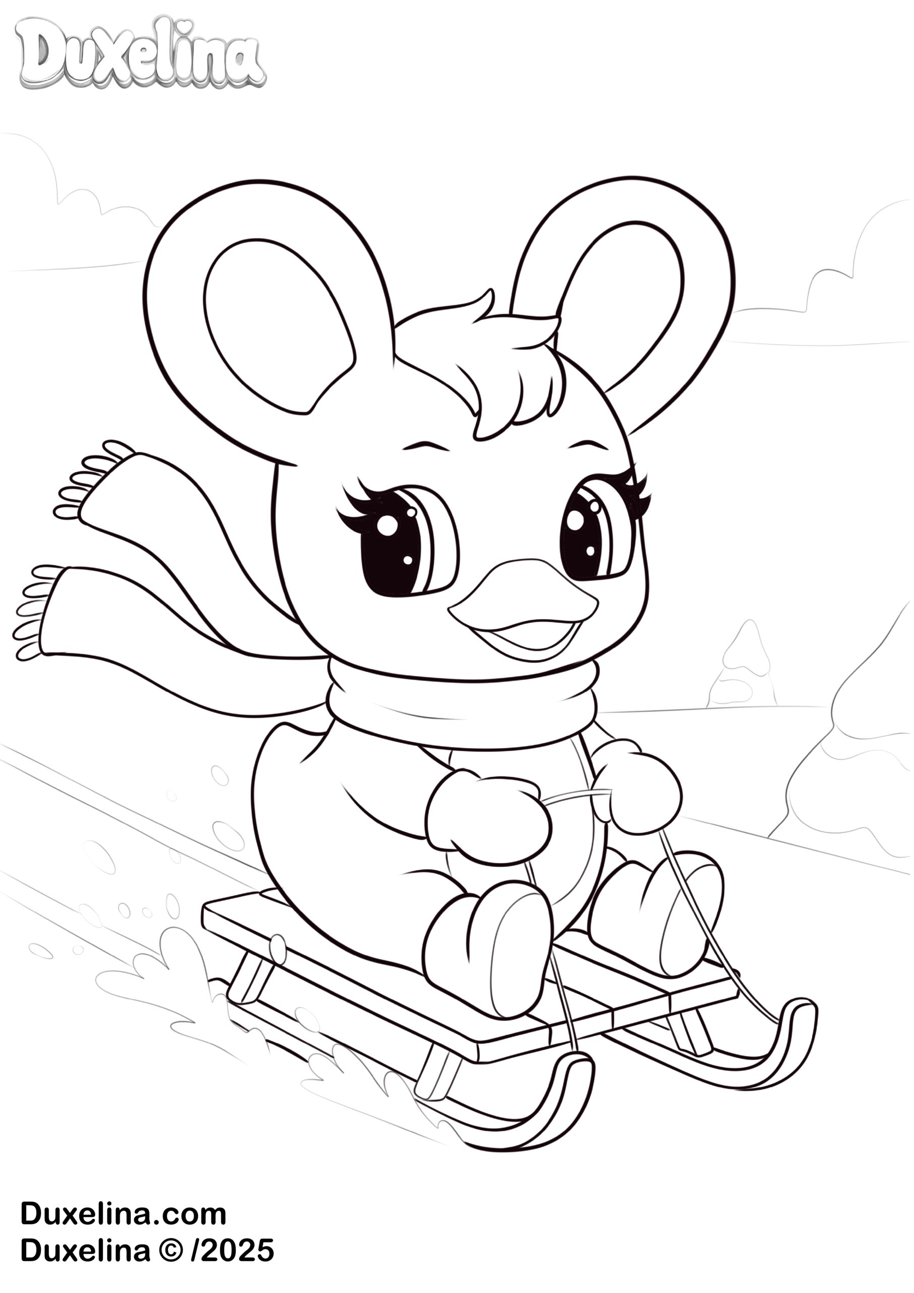 Meet Duxelina! She is the most adorable cute rubber duck who loves playing in the sparkling white snow. She is seen happily speeding down the hill on her bright red sled! This fun scene is one of our best easy coloring pages for kids. Duxelina is ready for a fantastic winter coloring page adventure, wrapped snugly in her warm pink scarf.